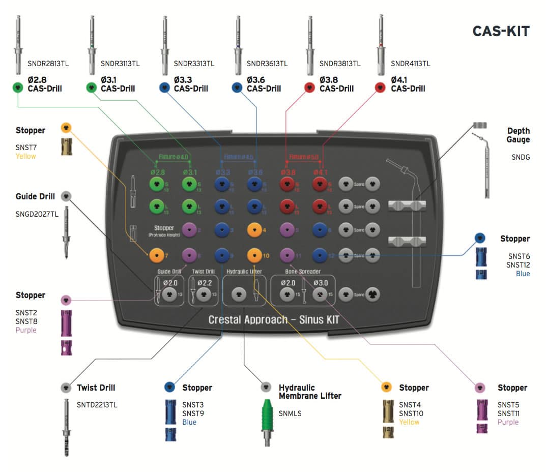 The Crestal Approach Sinus KIT (CAS-KIT) is specifically designed to easily and safely lift the membrane in the maxillary sinus from a crestal approach.
