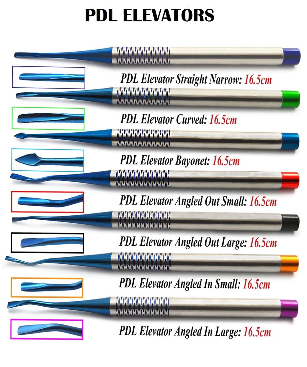 The Small Straight, Small Curved and Sharpened Spade PDL Elevator cover premolar to premolar in the maxillary and mandibular arches.